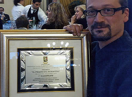 Nella categoria Montescudaio Rosso il primo posto come “il Pisano più schietto 2007” è stato assegnato dai giudici della Fisar al nostro Rosso 2006, prodotto con uve provenienti di vigneti della fattoria situati sui pendii delle colline che circondano Montescudaio: il vitigno prevalente è il sangiovese, con presenza di canaiolo, colorino, e teroldego (clone di zona di un vitigno friulano).